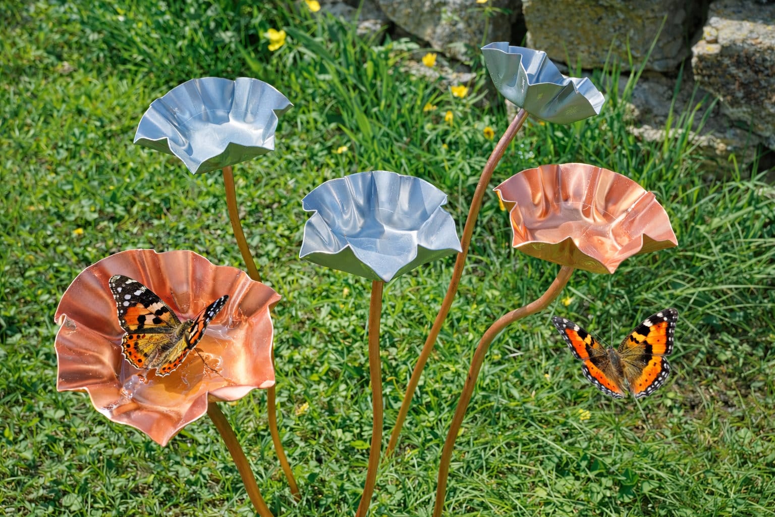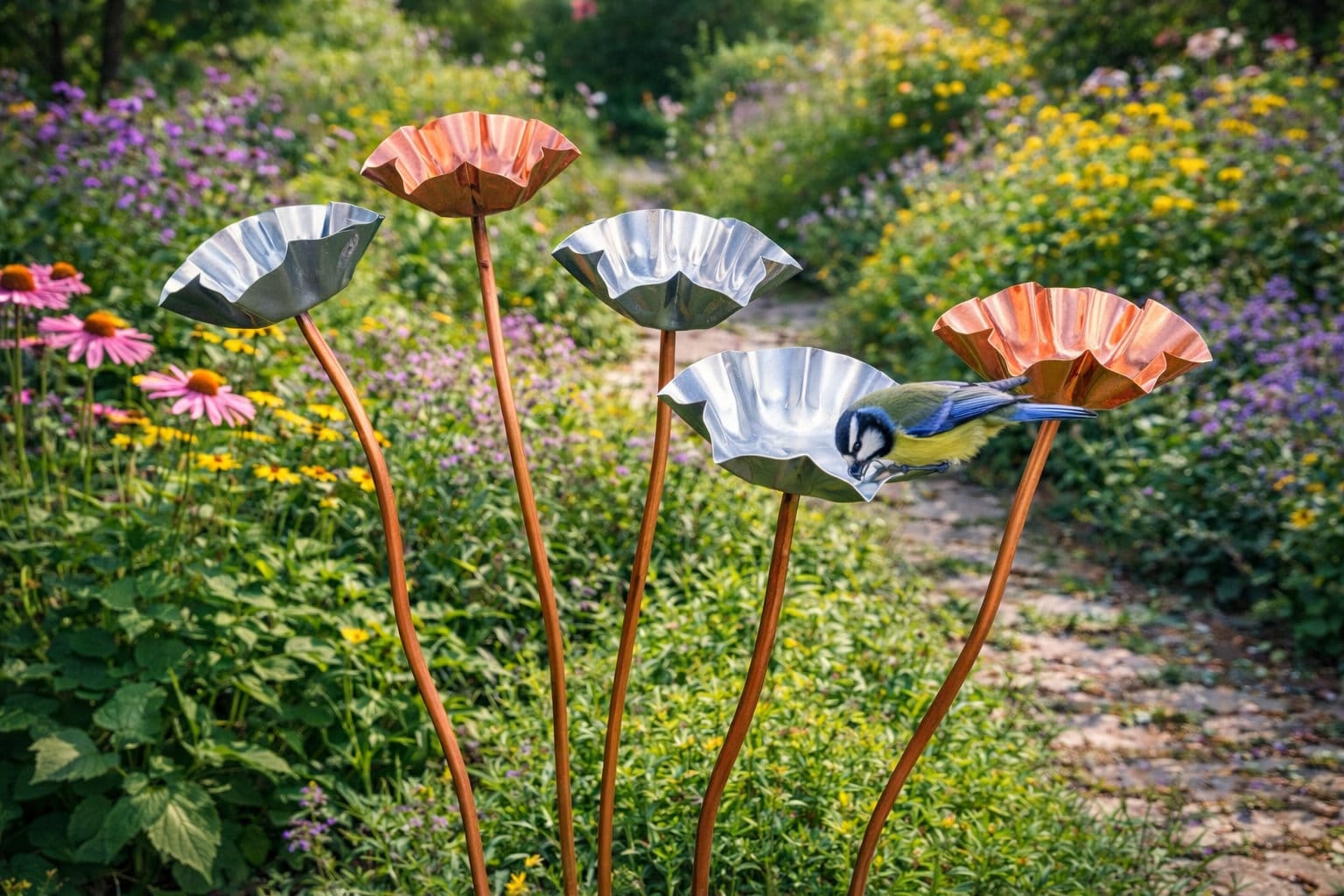 Plantez la fleur dans un sol stable et laissez la pluie remplir naturellement la coupelle. En période sèche, vous pouvez ajouter un peu d’eau pour continuer à attirer les oiseaux et insectes. Un nettoyage occasionnel permet de conserver une eau propre.